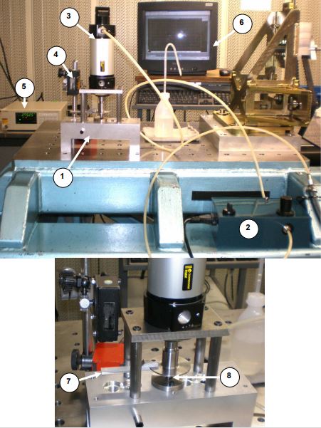 Le vérin pneumatique (3) commandé en tout ou rien par le pupitre de commande (2) fournit un effort constant sur l’ehrjs dont l’enfoncement est mesuré par un capteur laser (4) grâce à la cible (7). Le signal du capteur est traité par une centrale (5) puis acquis via un système rapide (configuré à 1kHz) (6). Il est ainsi possible de tracer l'allure du déplacement en fonction du temps.