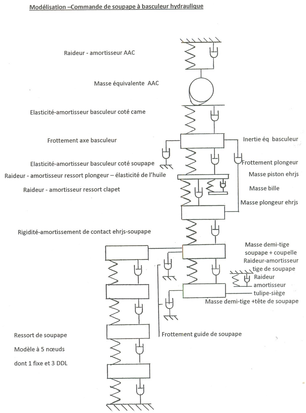 Pour une meilleure compréhension du fonctionnement hydraulique spécialement du clapet, la commande de soupape est modélisée sur ordinateur par un ensemble de masses concentrées reliées à des ressorts sans masse et à des amortisseurs visqueux constituant un système vibratoire à plusieurs degrés de libertés gouvernés individuellement par la loi de la mécanique de Newton.
